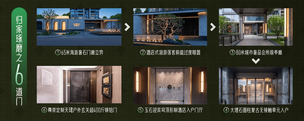 ①65米海派奢石门廊立势 ②酒店式洄逛落客前庭过渡喧哗 ③80米城市奢品会所级亭廊 ④大理石圆柱复古无触单位入户 ⑤玉石送宾穹顶形制酒店入户门厅 ⑥定制沉超400斤的入户铸铝门对线平方公里”(由高新区投放)
